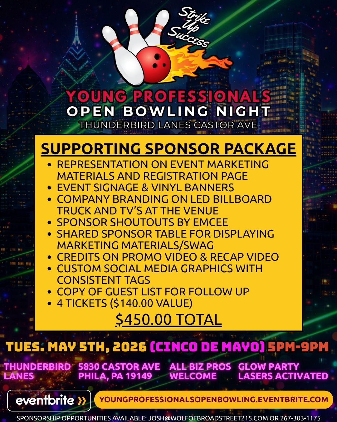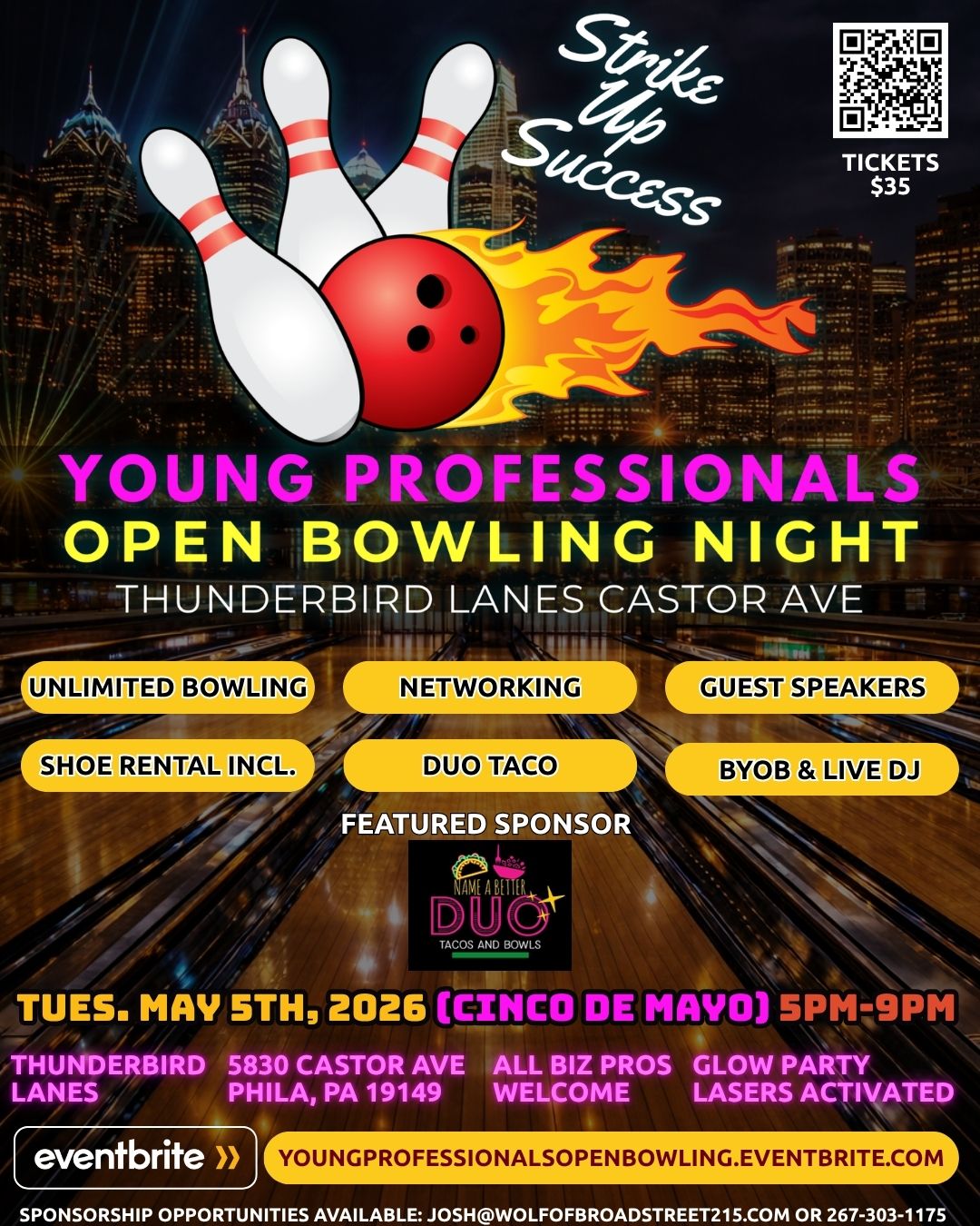 Join us on Tuesday, May 5, 2026 from 5 PM to 9 PM at Thunderbird Lanes on Castor Avenue for a Cinco de Mayo evening built for connection, conversation and a great time. This 21+ event brings together young professionals and business-minded guests for a unique after-work experience that blends networking, music, food, a guest speaker and unlimited bowling under the glow party lights.